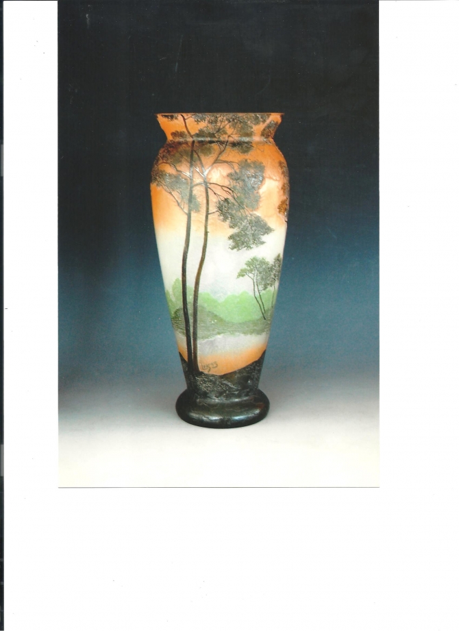 Legras 1900 ca,vaso con decoro a smalti e corroso ad acido di paesaggio dei Vosgi, su fondo ghiaccio e arancio, H cm36, firmato "Legras" in rilievo.