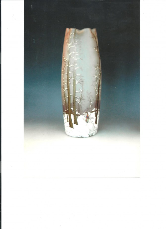 Legras 1900 ca, vaso con decoro a smalti di paesaggio innevato, alberi e figura su fondo grigio H cm 36.