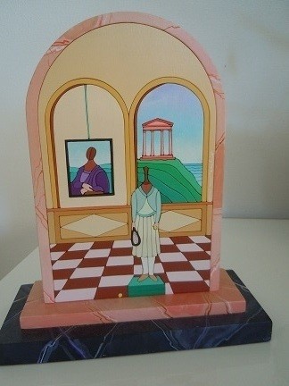 Bifacciale, Al verso: In cerca di un campo da tennis acrilico su tarsia, cm 20x12,5, 1999